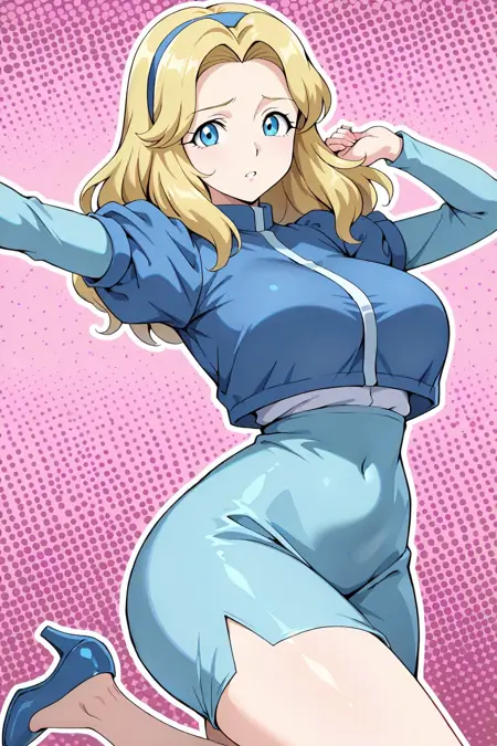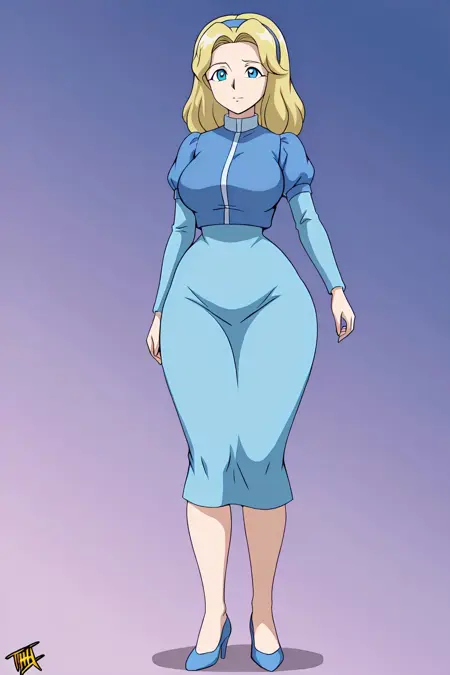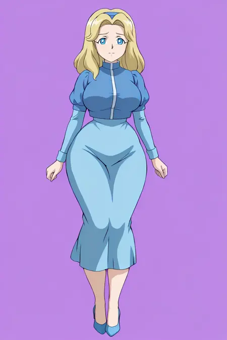 MariaRobotnikSX, 1girl, blue dress, long sleeves, light blue skirt, blue headband, blue high heels, blonde hair, blue eyes, maria robotnik