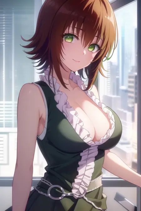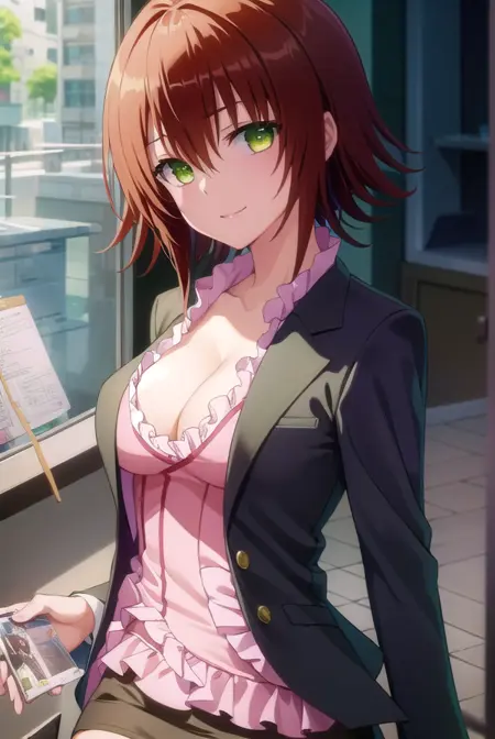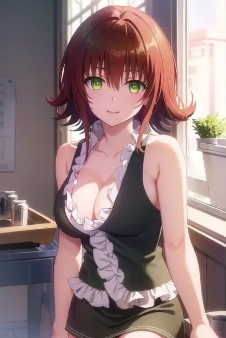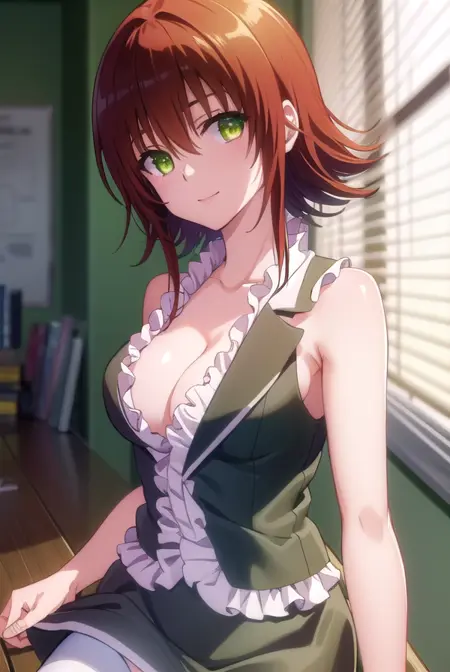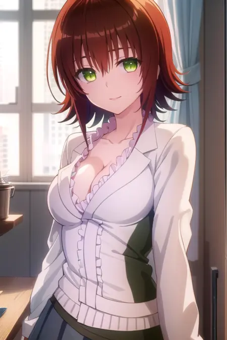 ryouko mikado, 단발, 눈 사이의 머리카락, (녹색 눈:1.5), 빨간 머리카락, 머리카락이 얼굴을 가림,