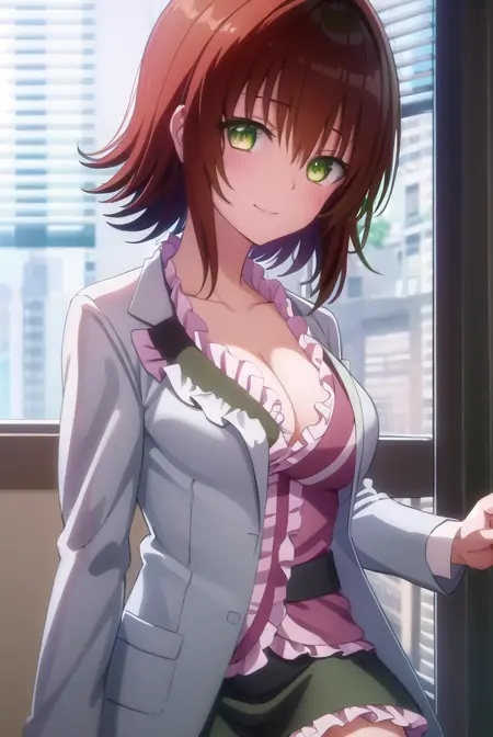 랩코트, 스커트, 셔츠, 허벅지 고프, 젖꼭지 노출, 프릴, 검은 스커트, 분홍 셔츠, 프릴 셔츠,