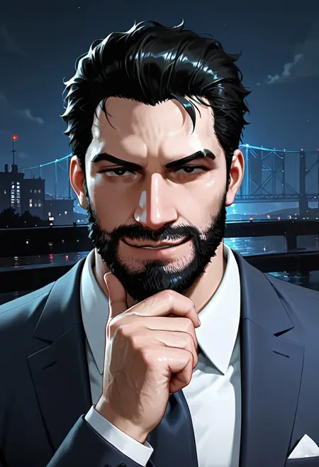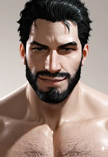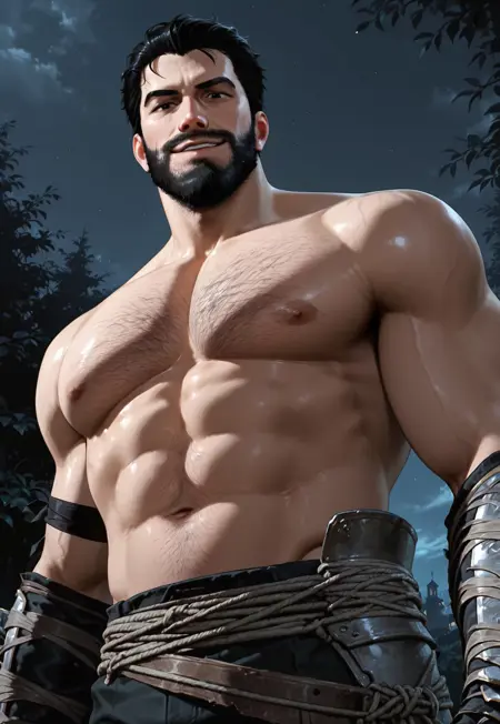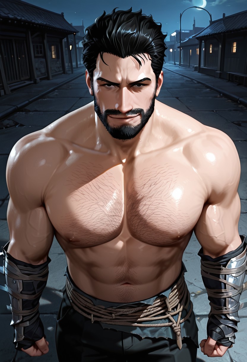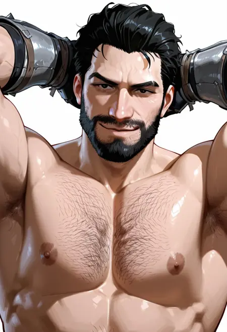 Propms: Br7c3L, 1boy, solo, male focus, black hair, short hair, facial hair, beard, black eyes, perfect eyes, muscular, bara, mature male, topless male, hairy, chest hair, pectorals, gauntlets, pants,