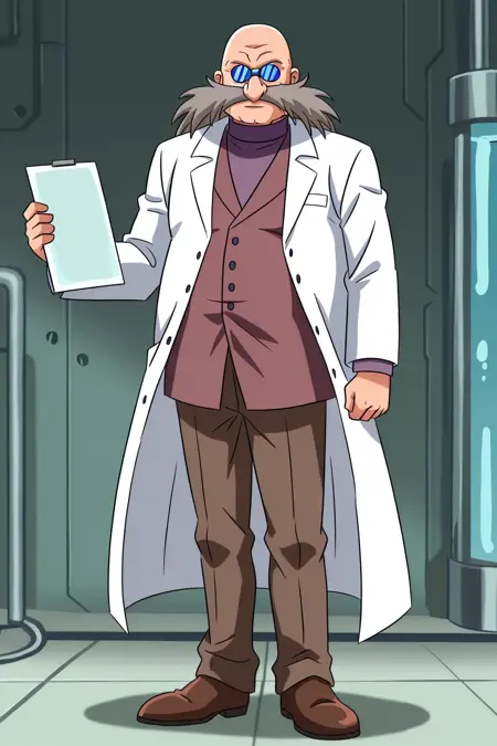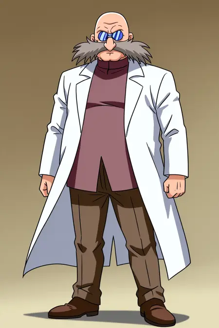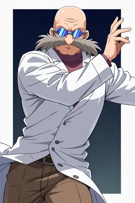 GeraldRobotnikSX, 1boy, white scientist's lab coat, distinctive long white mustache, brown trousers, matching brown shoes, maroon red shirt, blue goggles, bald, gerald robotnik