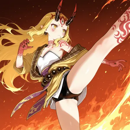 ibaraki_douji, long hair, blonde hair, yellow eyes, horns, pointy ears, tattoo, facial mark, oni, white forehead mark, body markings, red hands, red feet, sharp nails, black nails