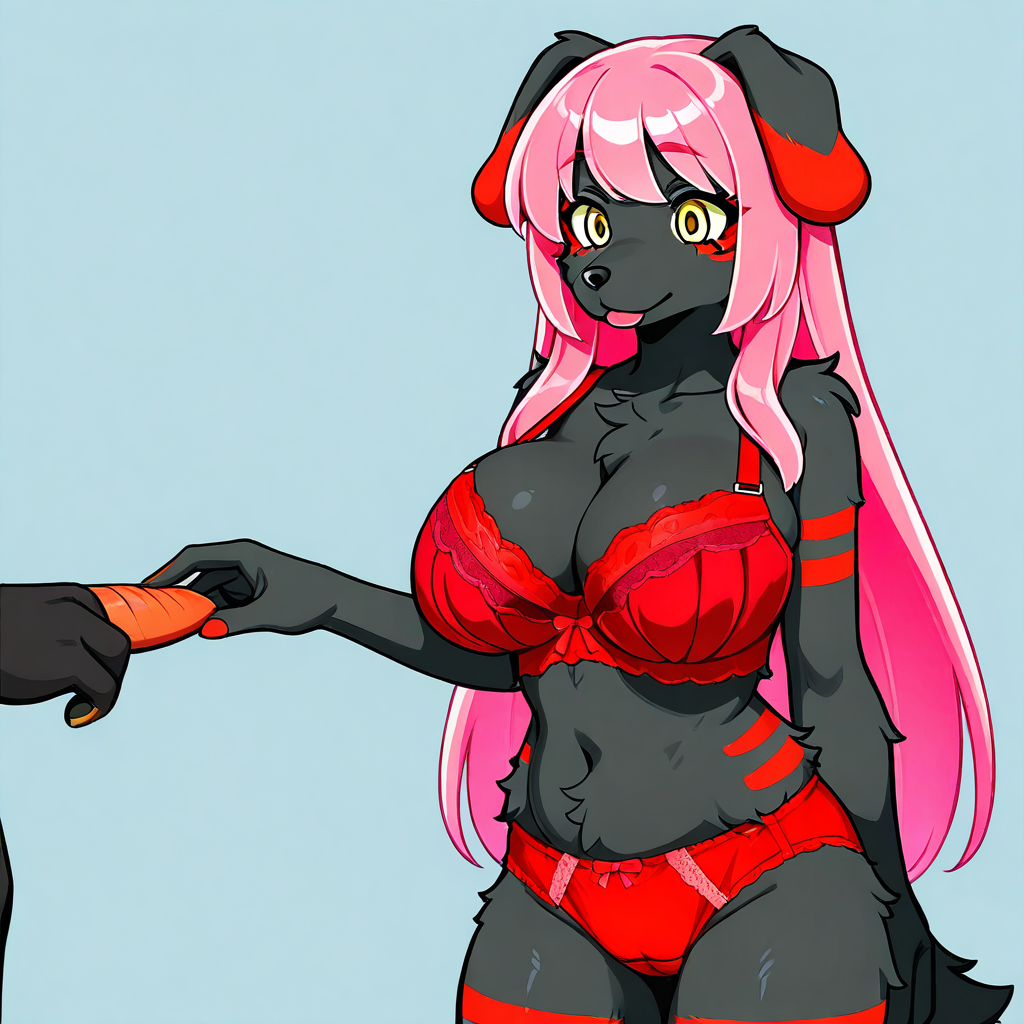 long hair, pink hair mixed with red at the tip of the hair, yellow eyes, pink and red bra, red panties with orange stripes, big breasts, Labrador, black fur, dog, 1girl, floppy ears,