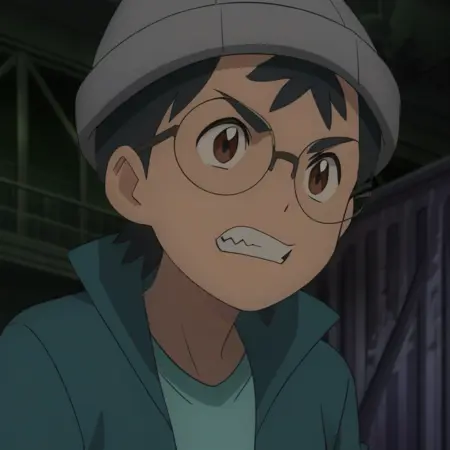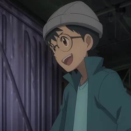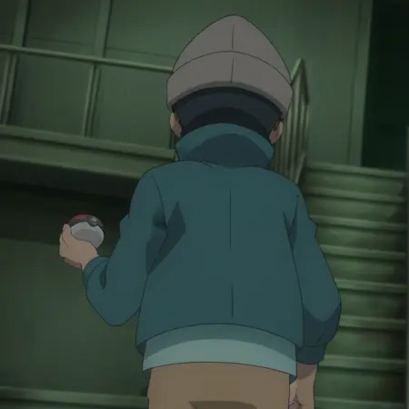 프롬프트: 남성, 검은 청록색 머리카락, 비니, 갈색 눈, 안경, 청록색 속옷, 재킷, 긴 소매, 벌어진 옷, 흰색 바지, 파란색 신발, 포켓볼 들고 있음, 포켓볼(기본), 실내(계단), 선박 내부