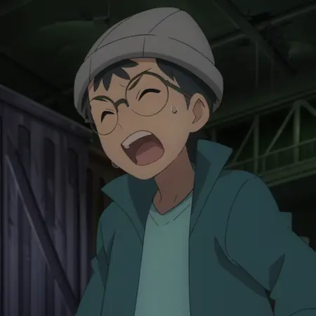 プロンプト:男性、ダークティールの髪、ビーニー、茶色の目、眼鏡、ターコイズのアンダーシャツ、ジャケット、長袖、開いた服、ターン色のズボン、青い靴、ポケボールを握っている、ポケボール(基本)、屋内(階段)、船の内部