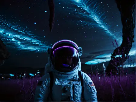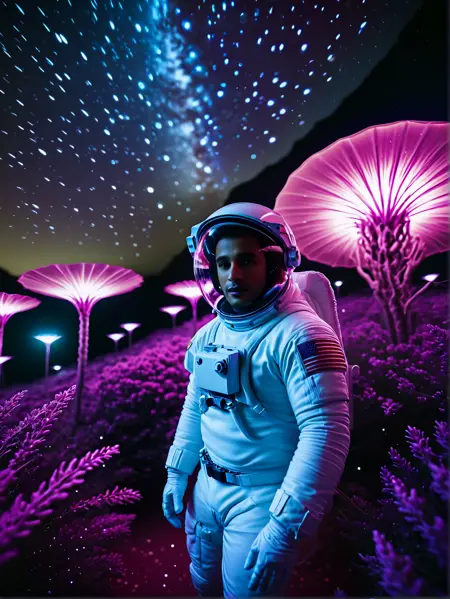 ピンクの惑星。ピンクの草。宇宙飛行士の顔とvisorに極近接。広角魚眼レンズ。低角度ビュー。シネマチック映画の静止画。ナイト。夜間。星。暗闇。