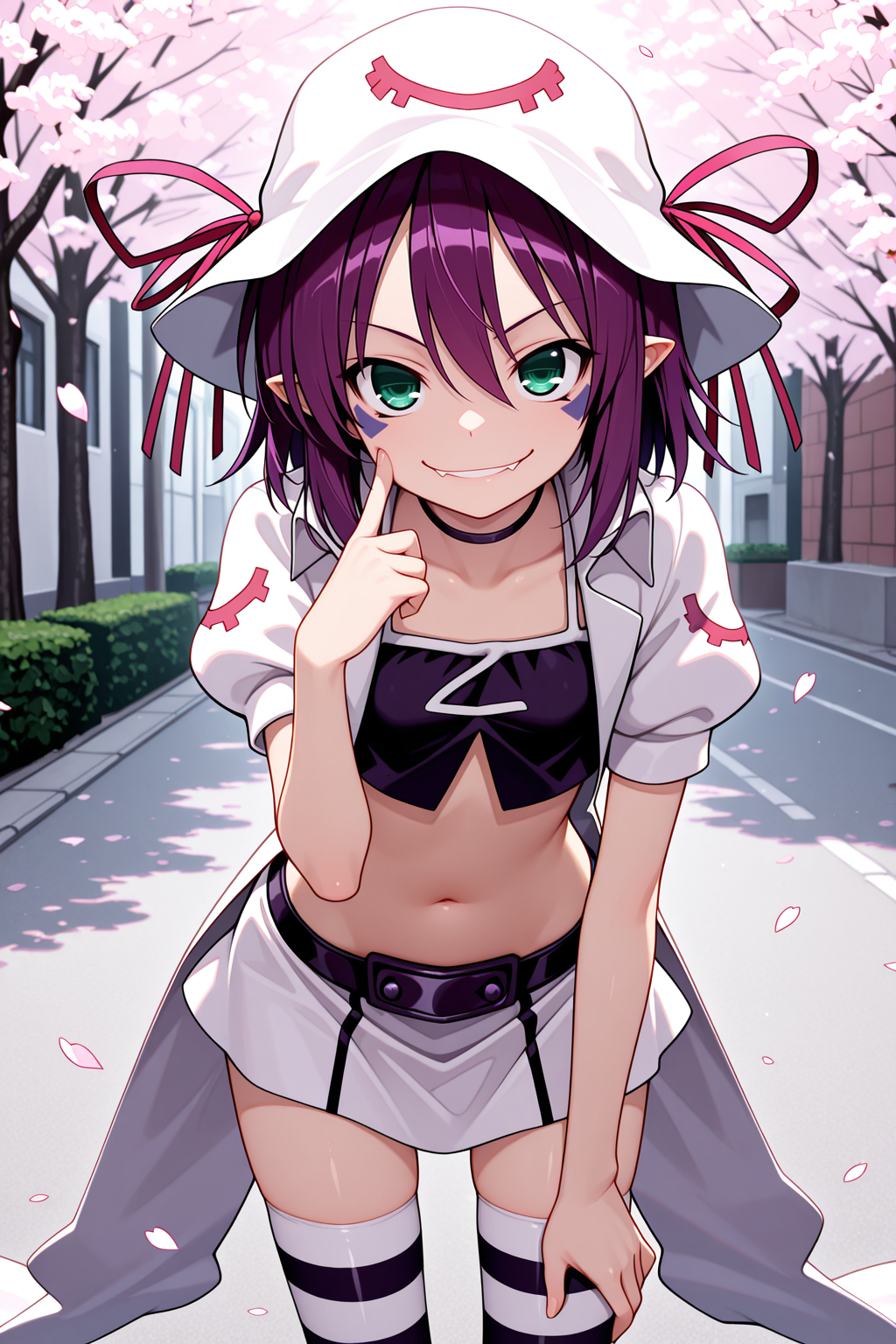 navel, white jacket, short sleeves, puffy short sleeves, tailcoat, hat, white hat, choker, ribbon, skirt, striped thighhighs