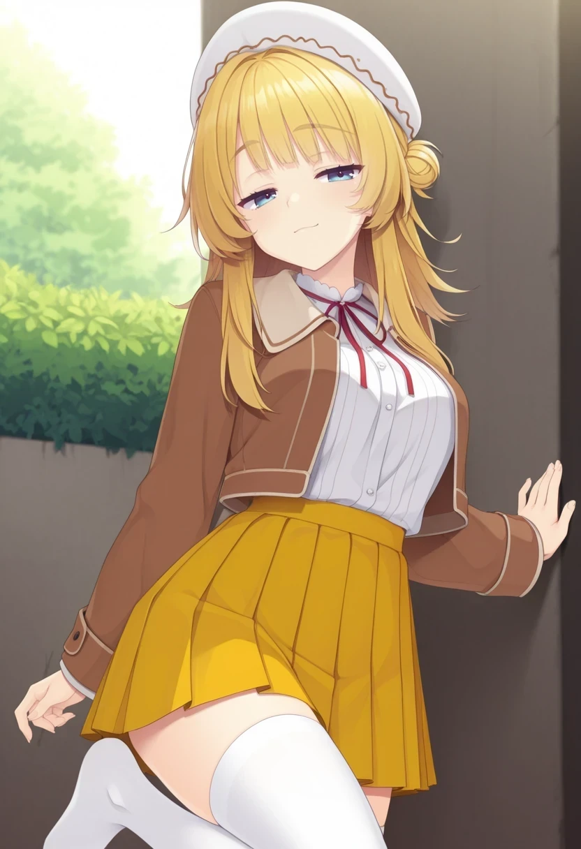 发夹,蓝色蝴蝶结,蓝色裙子,格子裙,百褶裙,白色衬衫,白色过膝袜,短袖,