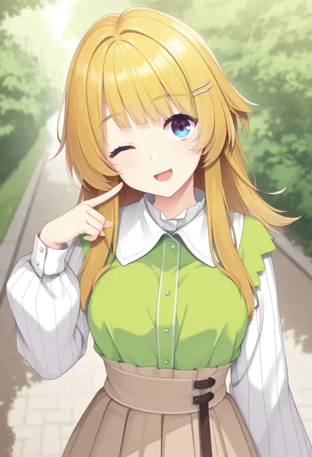 绿色衬衫,白色袖子,白色衣领,长袖,有领衬衫,发夹,百褶裙,浅棕色裙子,