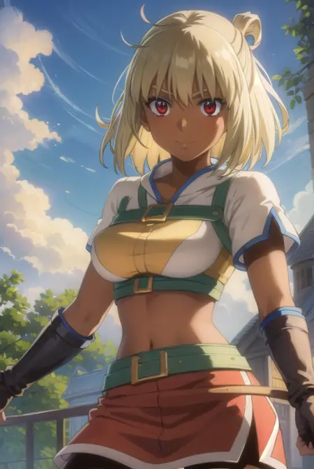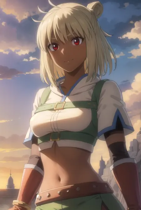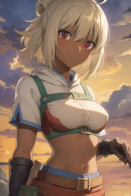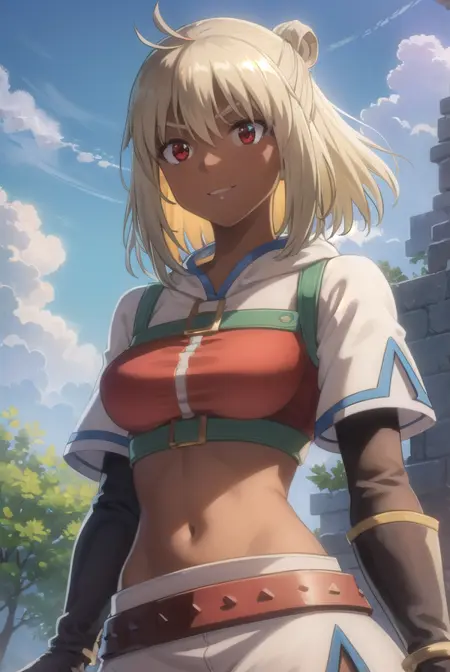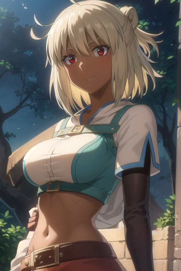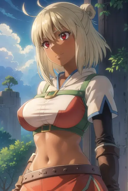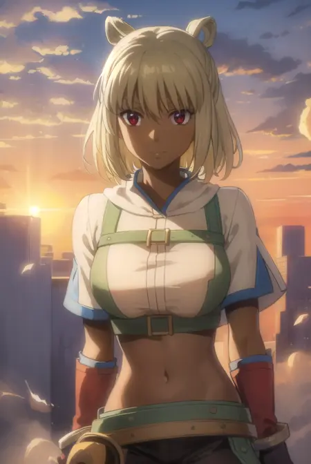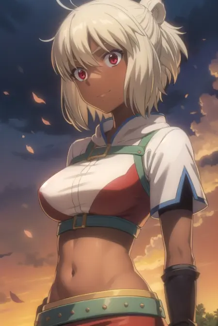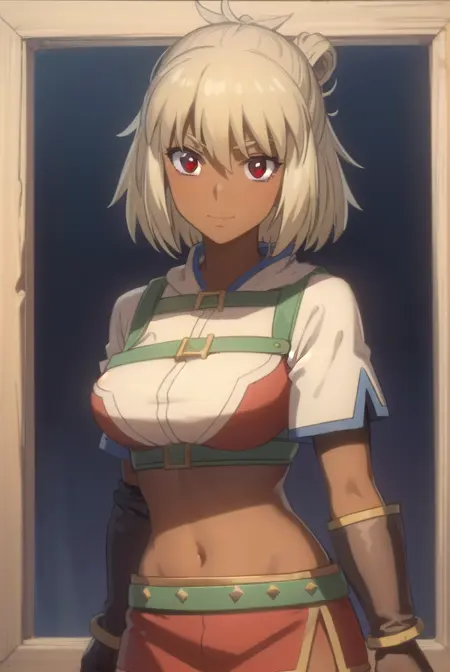 ragnarok judia, 단발, 앞머리, 금발, (빨간 눈:1.5), 검은 피부, 머리 뭉치, 검은 피부를 가진 여성, 안테나 머리카락, 점, 입 아래 점,