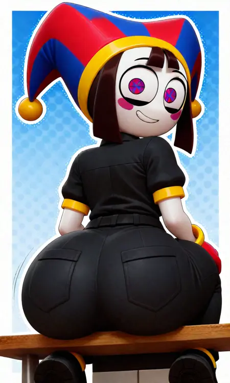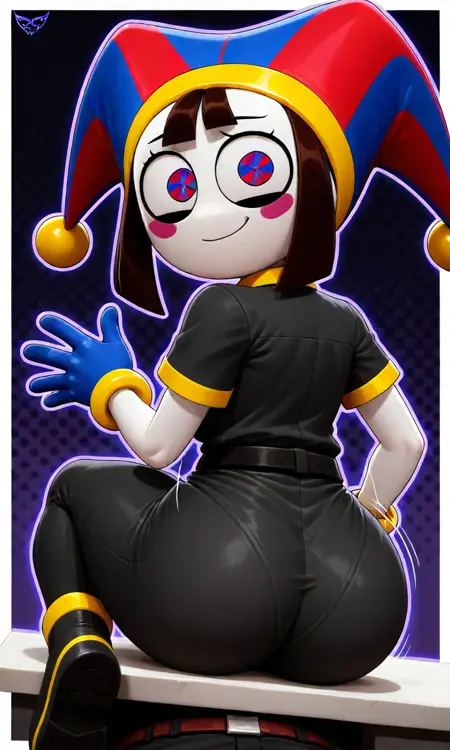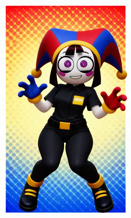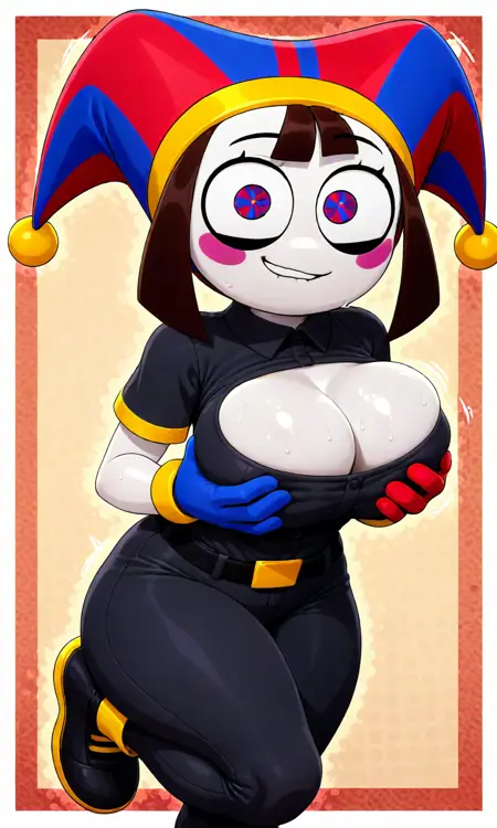 Tags: spudsy_pomni, blue eyes, red eyes,white skin, brown hair, black shirt, symbol-shaped pupils, blush stickers, red gloves, jester cap, blue gloves, black shirt, black pants, black shoes, black belt