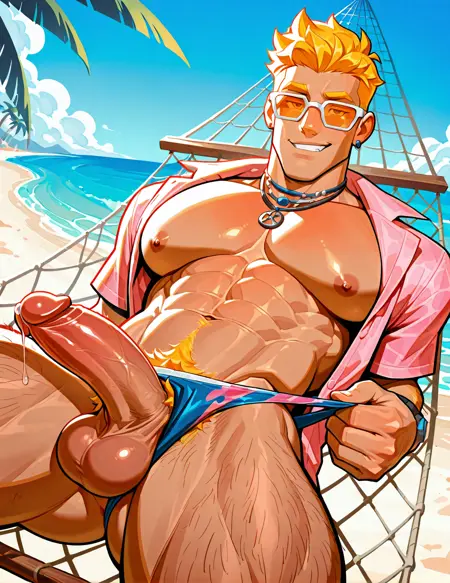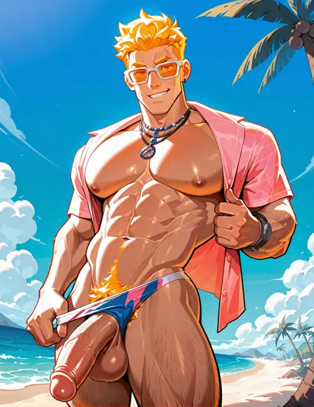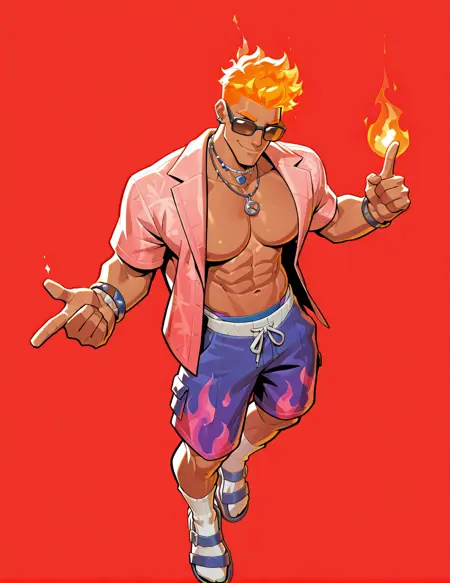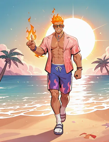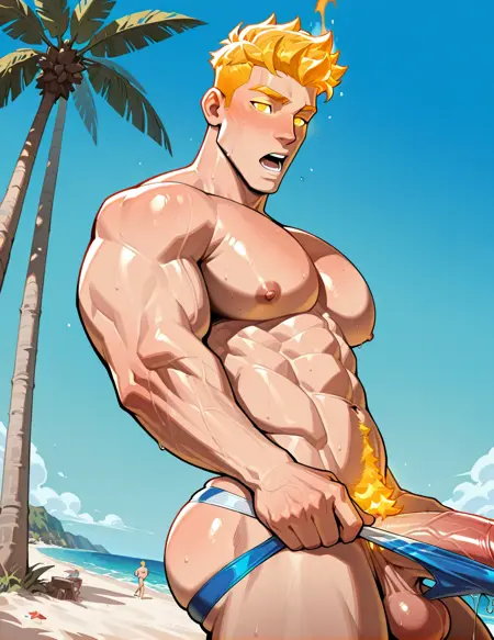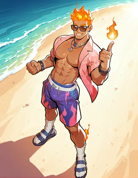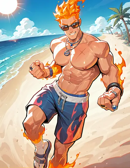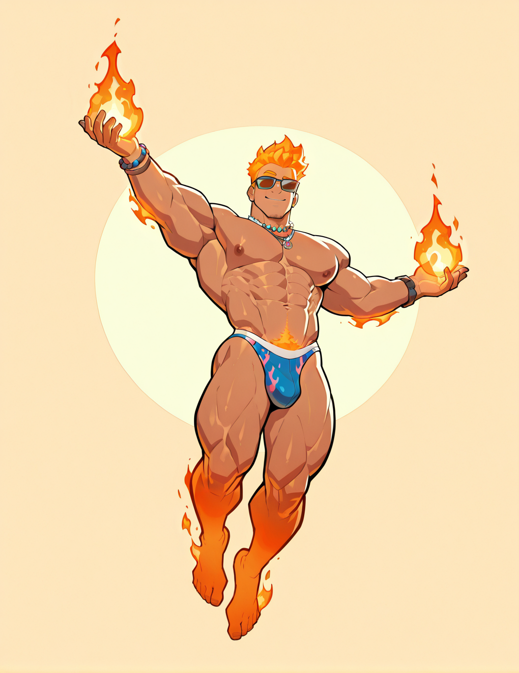<lora:HUMAN_TORCH_SUMMER:1> human_torch_summer, male focus, muscular male, muscular, pectorals, short hair, blonde hair, abs, bara, solo, 1boy, jewelry, large pectorals, navel, necklace, nipples, sunglasses, fire, bracelet, earrings, looking at viewer, male swimwear, smile, dark skin