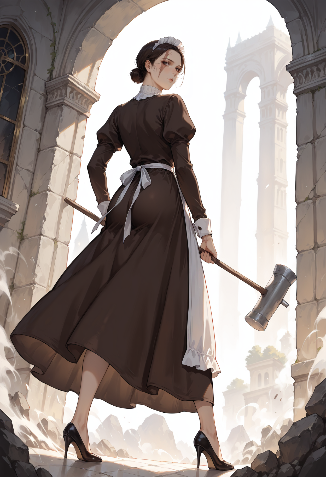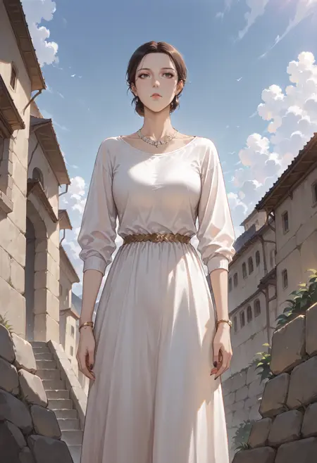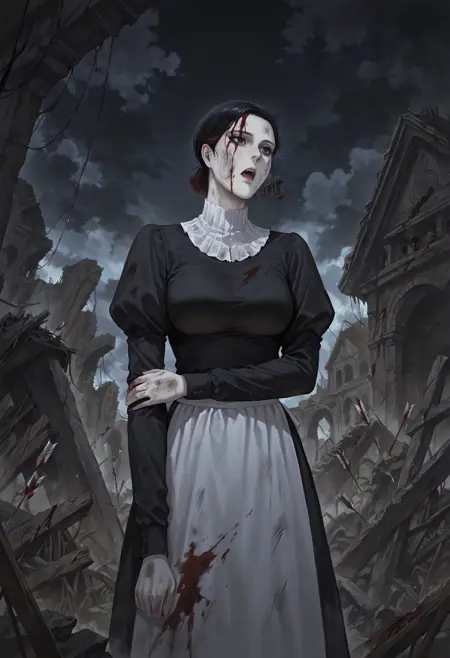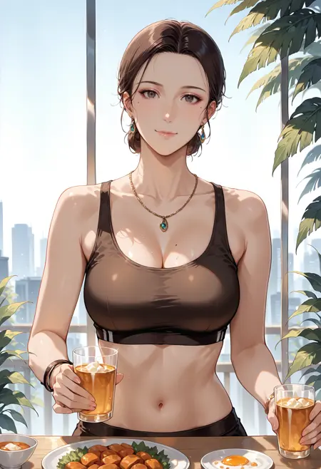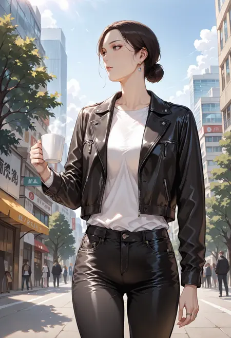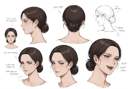 **Appearance:**1girl,black eyes,mole,mole under eye,brown eyes,black hair,brown hair,short hair,hair bun,single hair bun