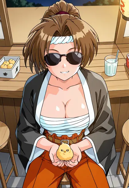 Bazaar Stall(的屋) : high ponytail, sunglasses, sarashi, cleavage, japanese clothes, belt,nejiri hachimaki, long sleeves, black happi, collarbone, wide sleeves, open jacket, orange pants, hair tie, pants rolled up