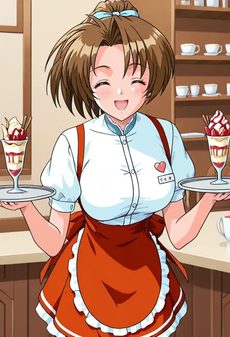 Server1(ファミリーレストラン) : high ponytail, waitress, white shirt, light blue hair bow, red apron, red skirt, miniskirt, heart badge, puffy sleeves, frilled apron, back bow, waist apron, blouse,lace collar, short sleeves, nametag