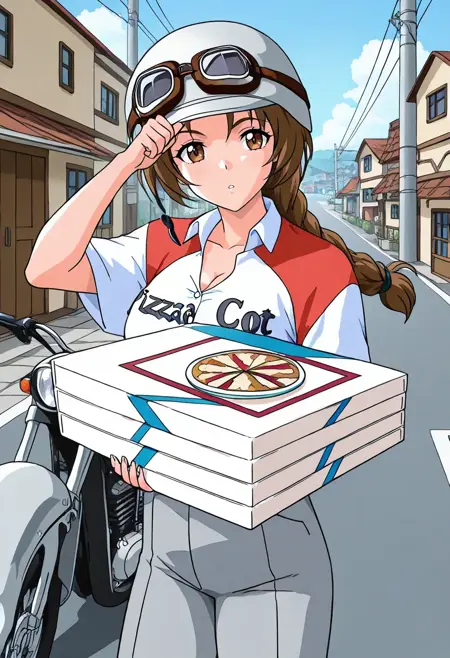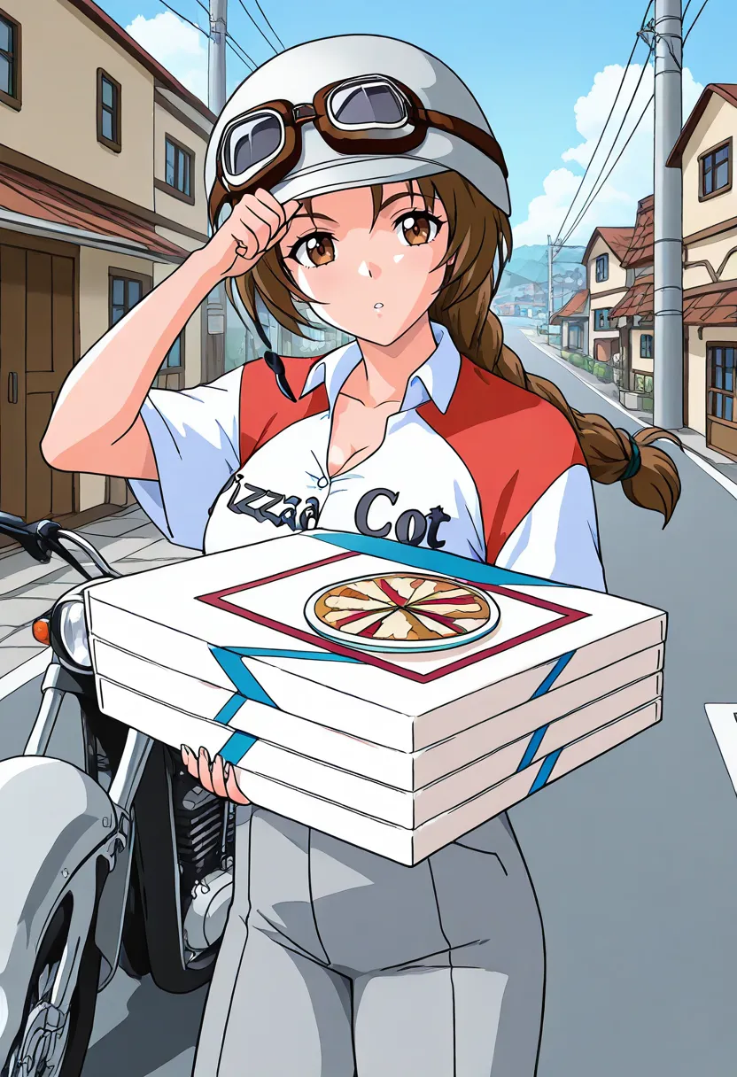 Pizza Delivery(宅配ピザ) : low ponytail, single braid, goggles, motorcycle helmet, grey pants, short sleeves, goggles on headwear, collared shirt, clothes writing,white headwear, collarbone, buttons, raglan sleeves, shirt tucked in, hair tie, two-tone shirt, brand name imitation