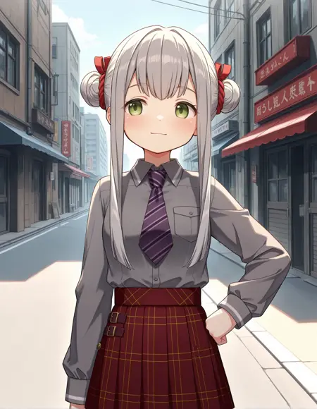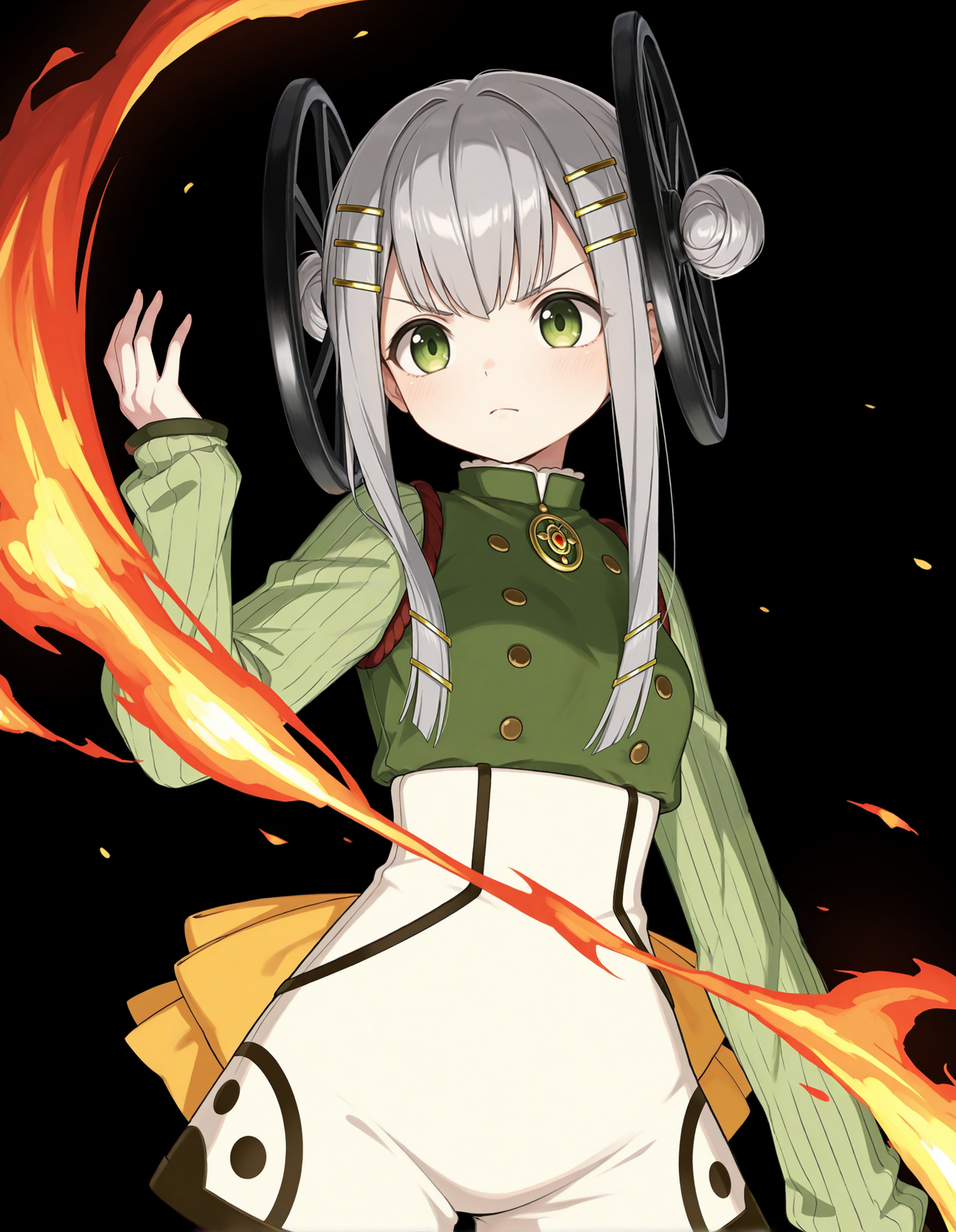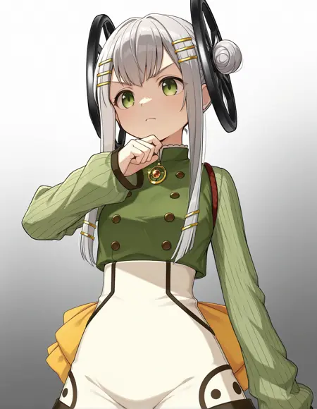 外貌: 灰色头发, 双髻, 长侧发, 绿色眼睛