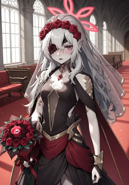 Trigger Words: EmblaFE1, grey hair, long hair, eyepatch, red eyes, halo, pale skin, pointy ears, black lips