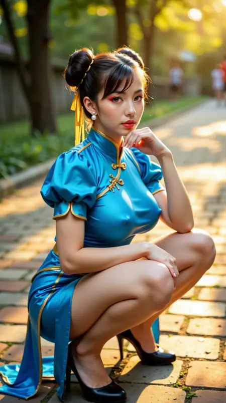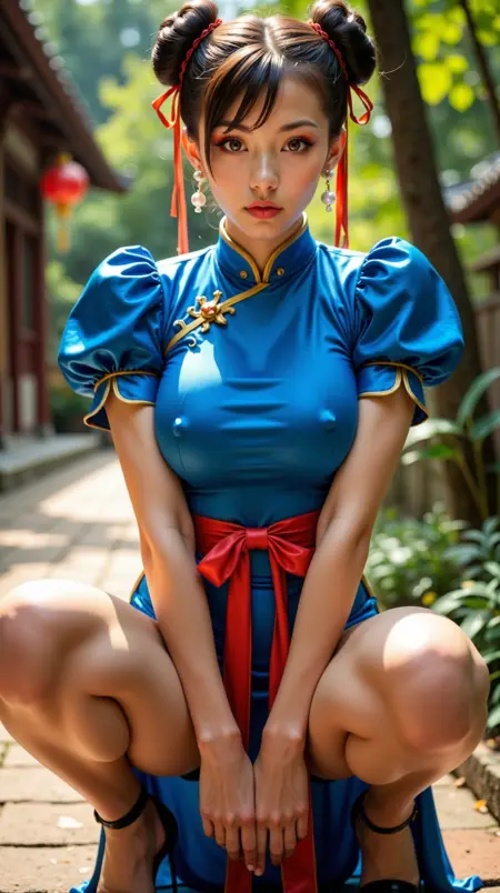 photography, back lighting, sunlight,photorealistic photo,realistic, chun li, solo, dress, double bun, breasts, pelvic curtain, hair bun, chinese clothes, china dress, jewelry, boots, covered nipples, white footwear, earrings, brown eyes, brown hair, sash, blue dress, puffy short sleeves, short sleeves, puffy sleeves, cross-laced footwear, large breasts, outdoors, panties, spread legs, looking at viewer, underwear, lips, sitting, spikes, full body, lace-up boots, makeup, thighs, bun cover, knee boots, no legwear, white panties, white sash