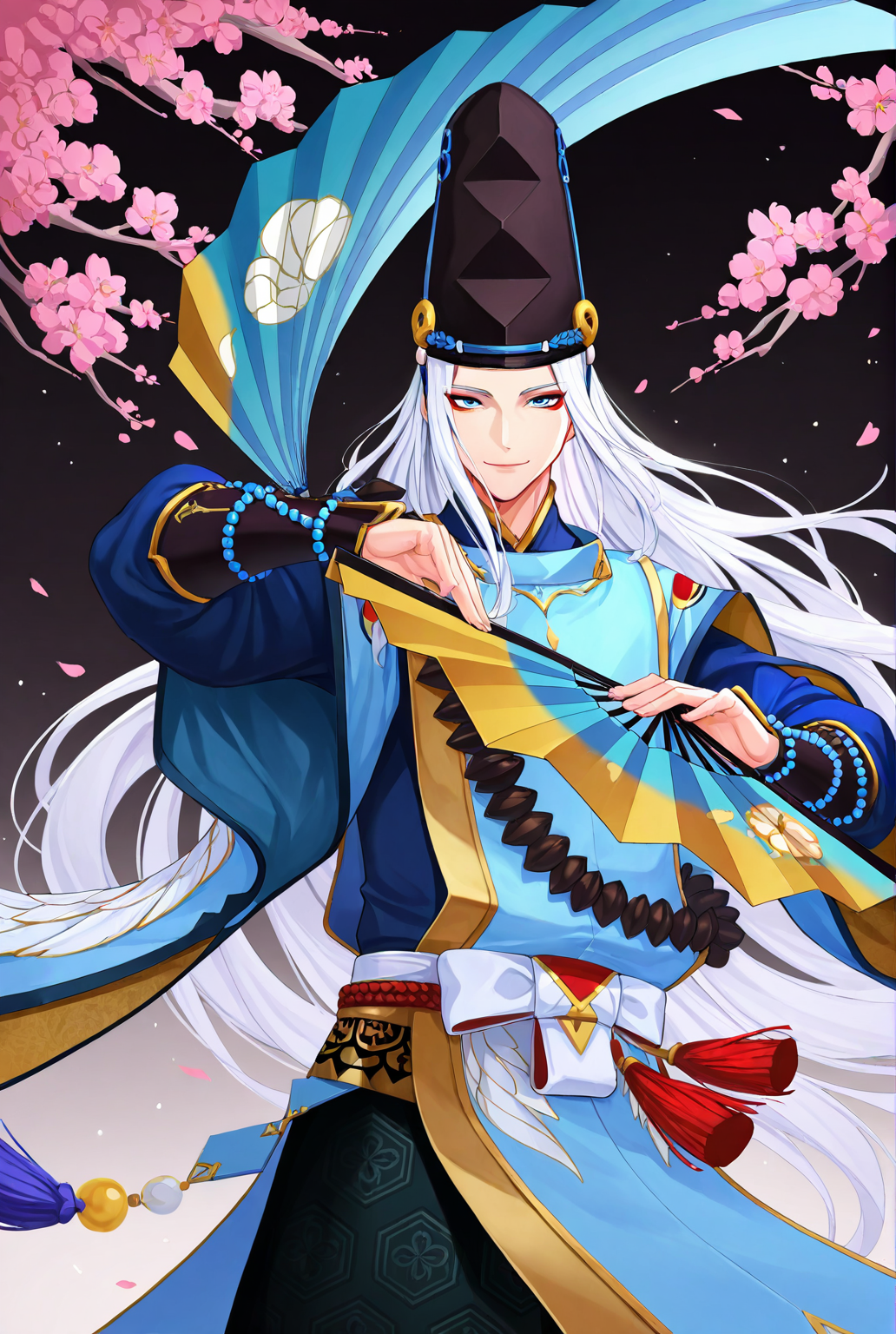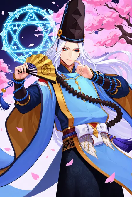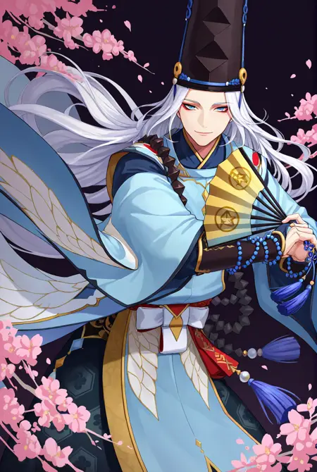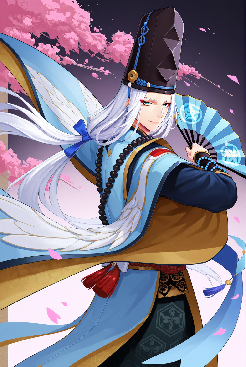 seimei 0, long hair, white hair, makeup, blue eyes, hat, black headwear, beads, tassel, wide sleeves, japanese clothes,