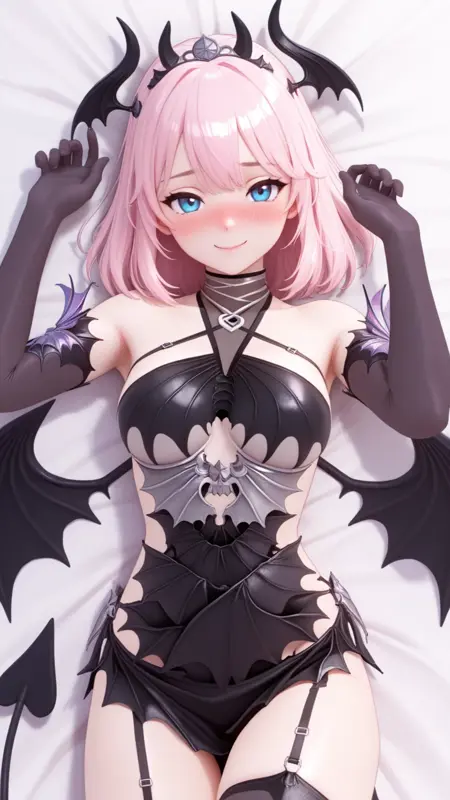 衣装プロンプト:elbow gloves, wings, bat wings, demon tail, garter straps, demon girl, thighhighs, tail