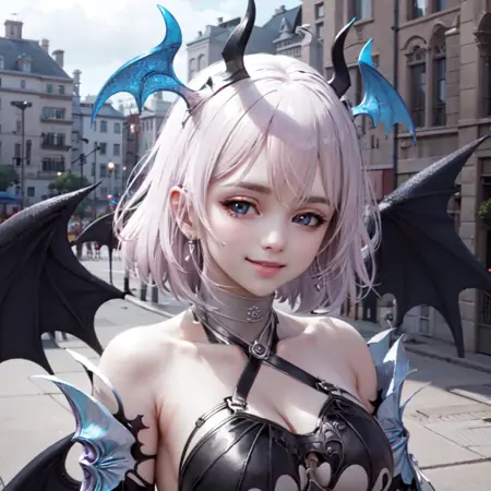 外观提示词:1girl, 蓝色眼睛, 粉色头发, 头饰, 恶魔角, 中等胸围