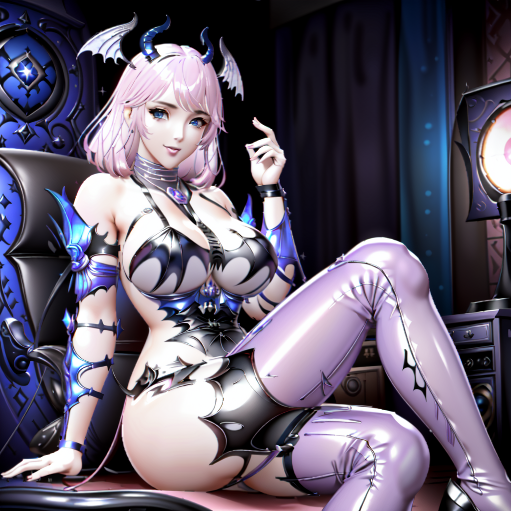 外观提示词:1girl, 蓝色眼睛, 粉色头发, 头饰, 恶魔角, 中等胸围