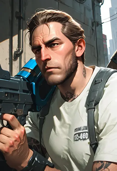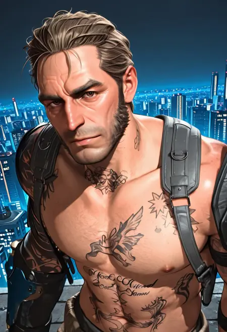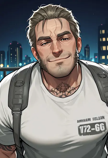 Digg3rHarkn3ss,1个男孩,单独,男性焦点,短发,胡须,背包,盔甲部件,手臂护甲,白衬衫,纹身,肌肉发达,衣服围绕腰部