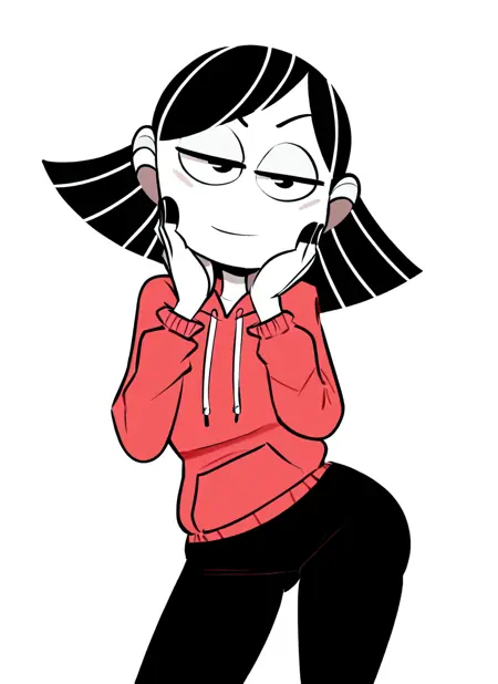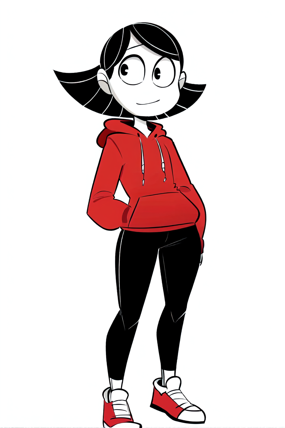 強化タグ: アンドロイド、白い肌、黒髪、フーディー、パンツ**