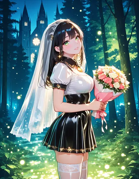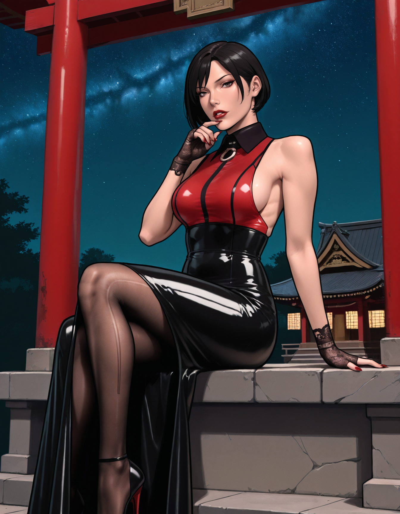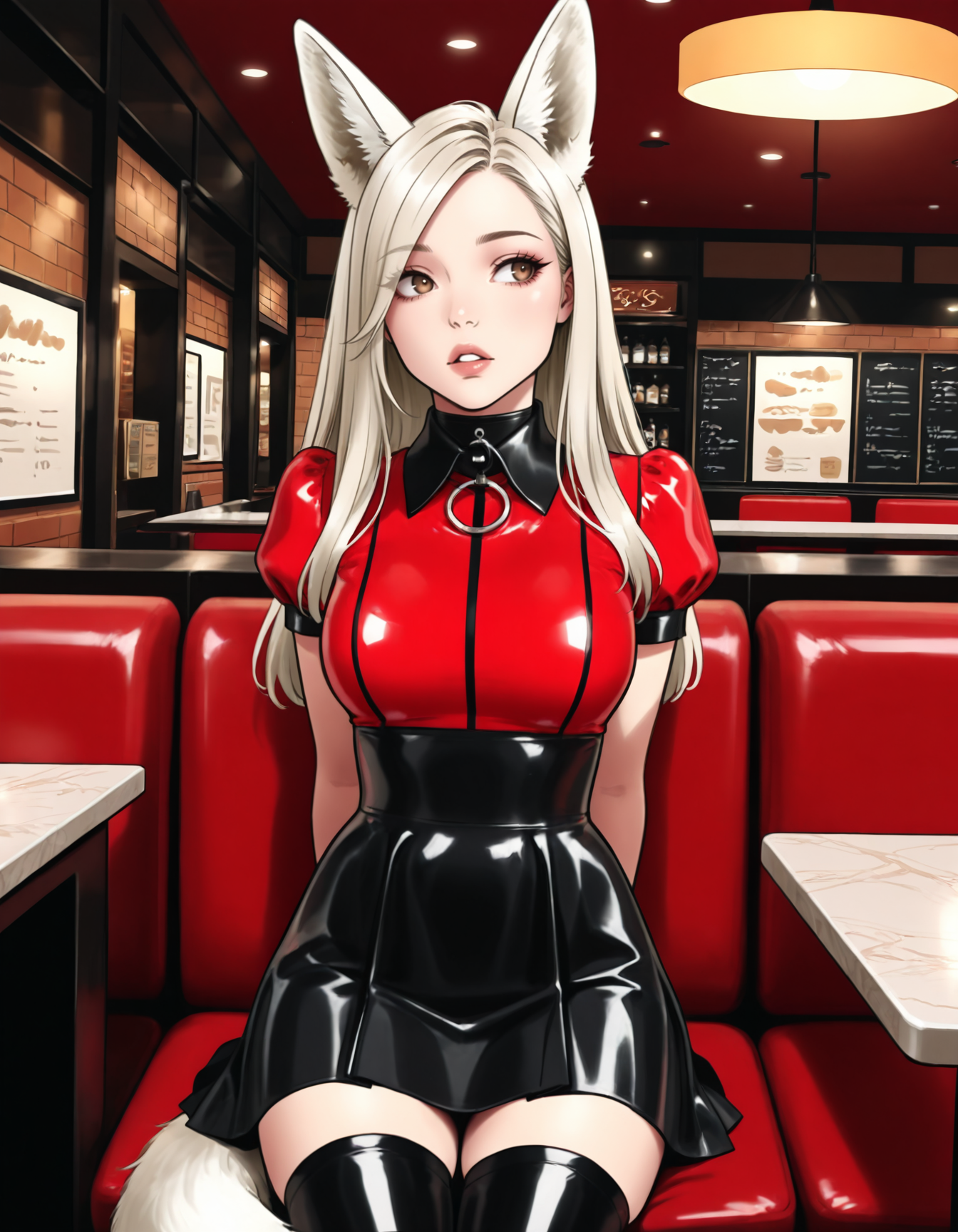 pinafore dress, latex, red dress, black trim, high-waist skirt, black skirt,puffy short sleeves, short skirt, collar, pleated skirt, shirt collar