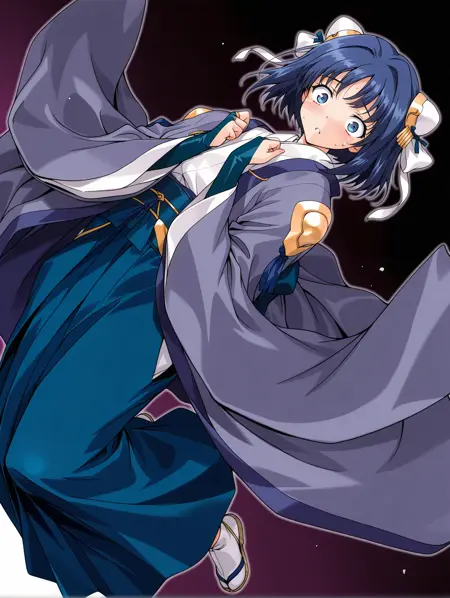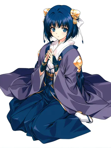 服装词:y_clothes, purple haori, long sleeves, cape, bridal gauntlets, blue hakama skirt, tabi