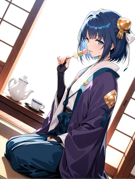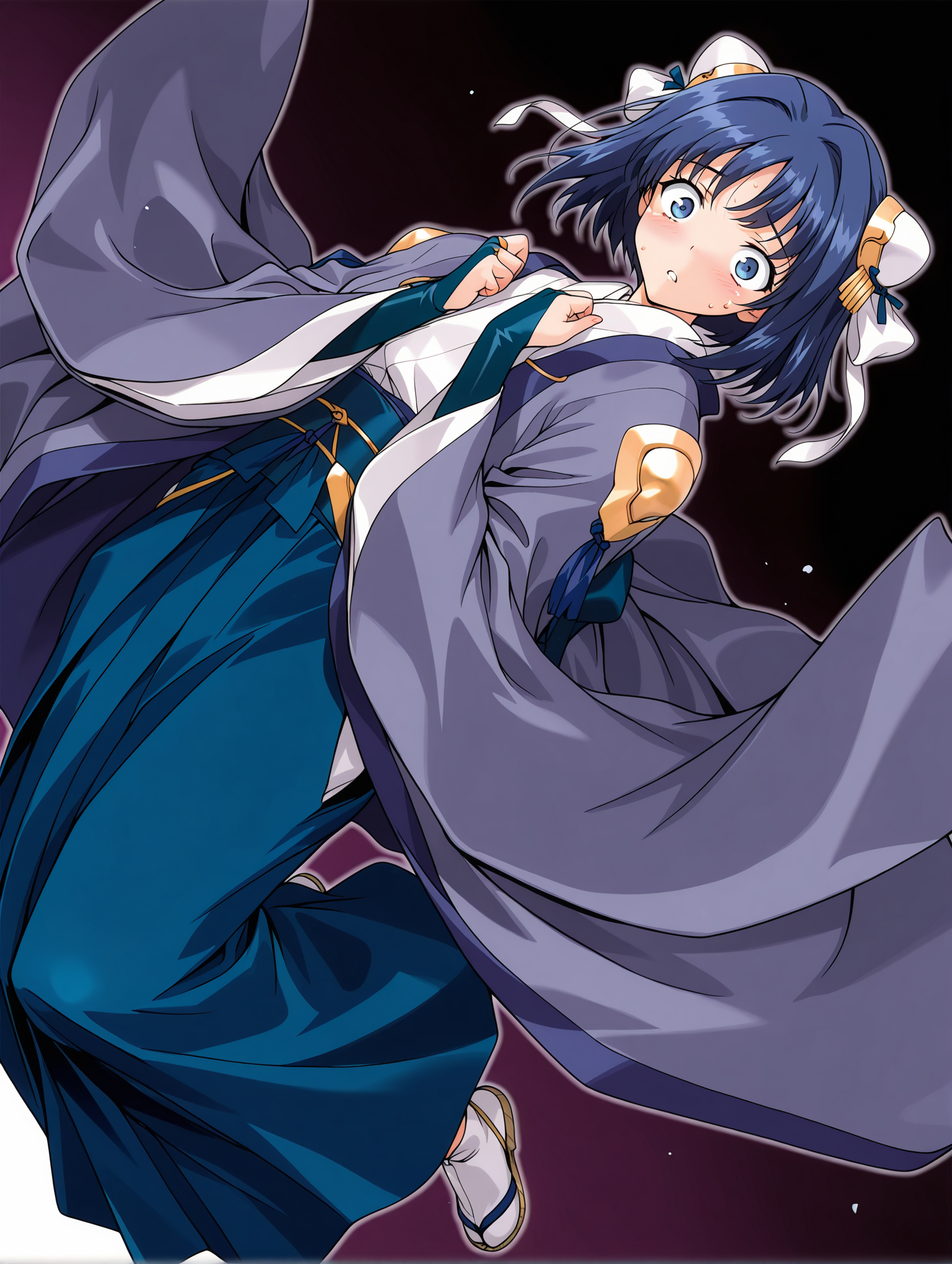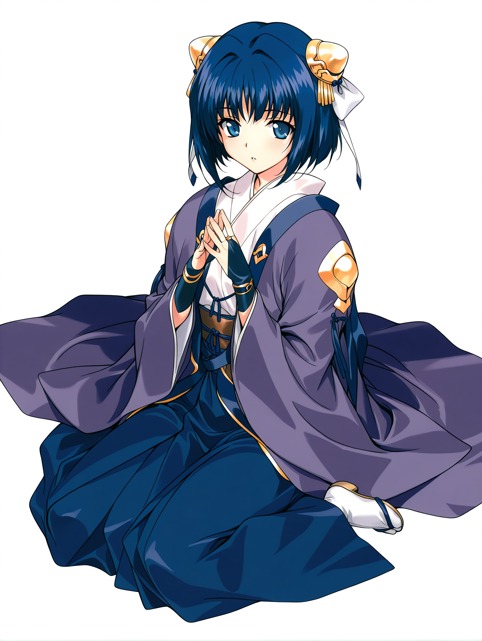 복장 단어: y_clothes, 보라색 하오리, 긴 소매, 망토, 신부 장갑, 청색 핫마 스커트, 타비
