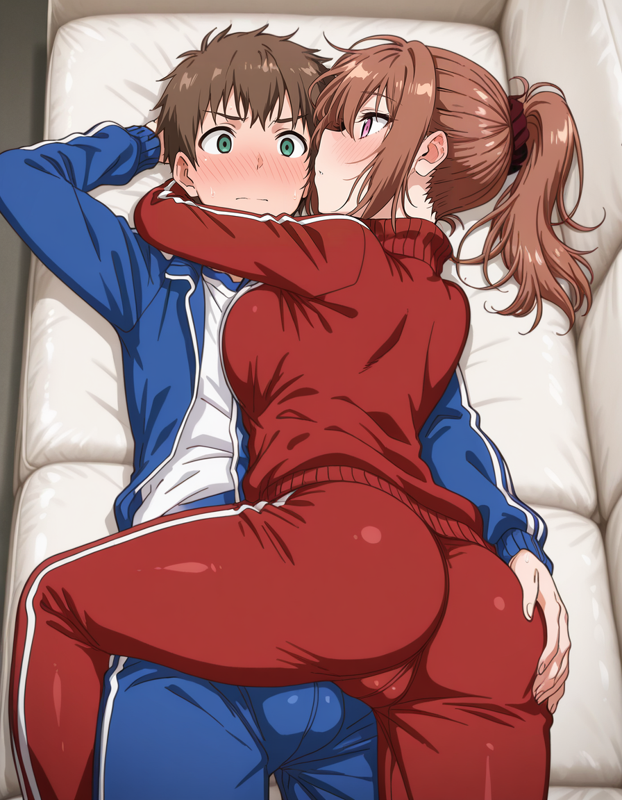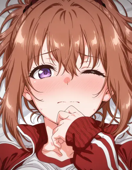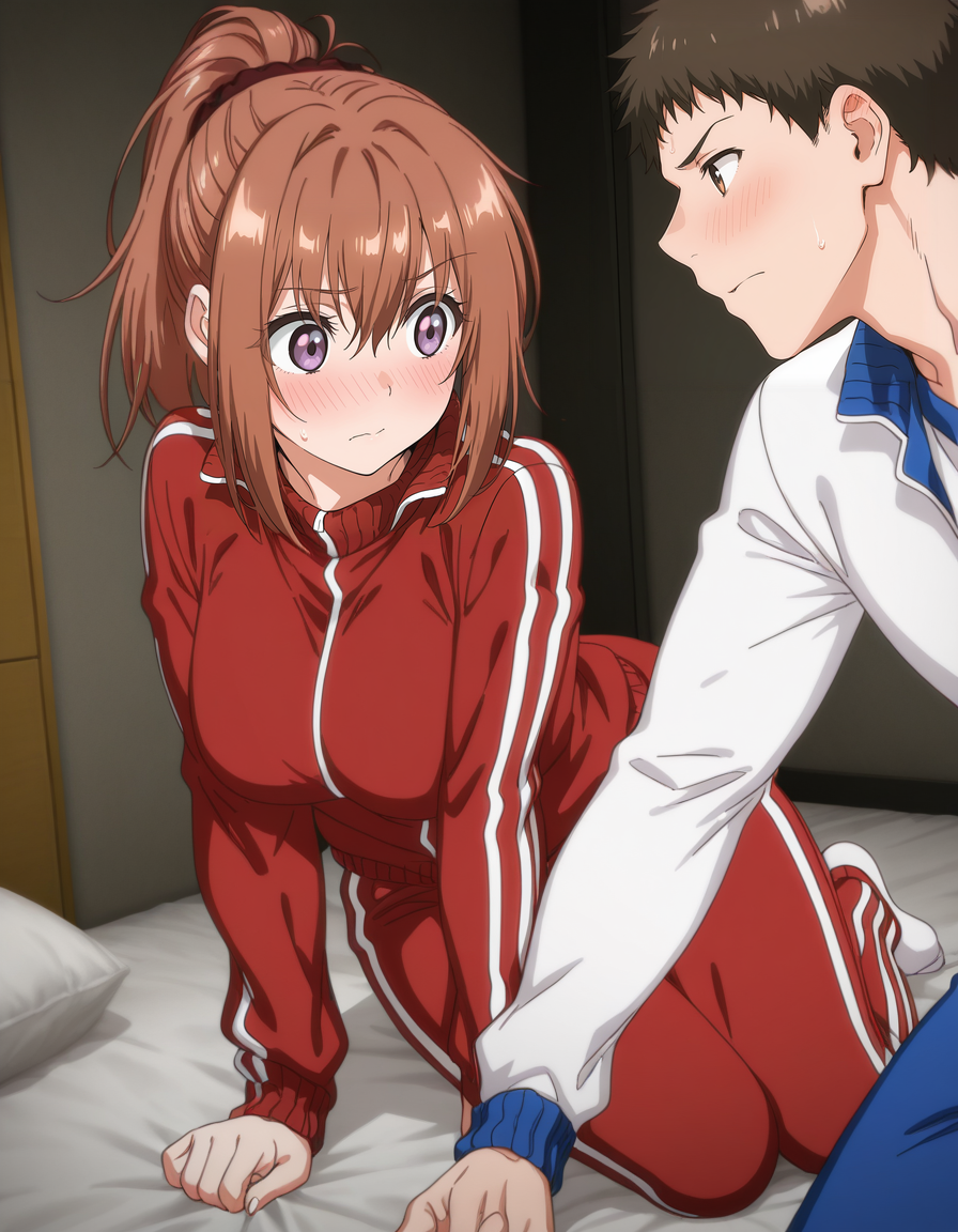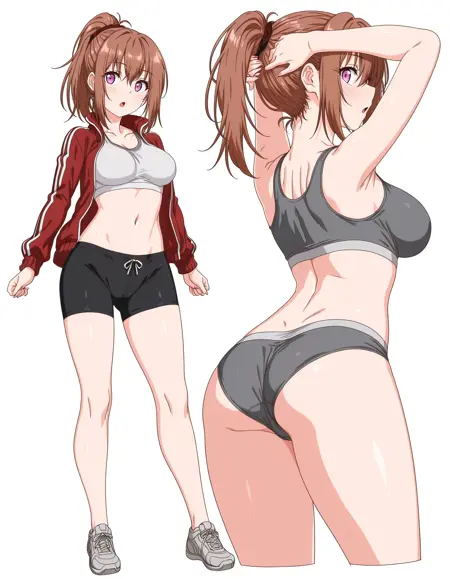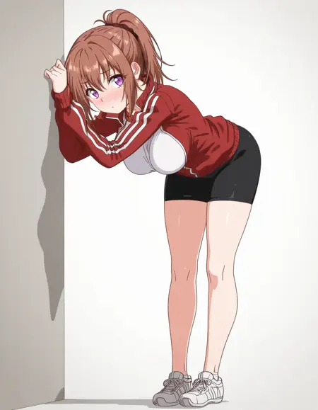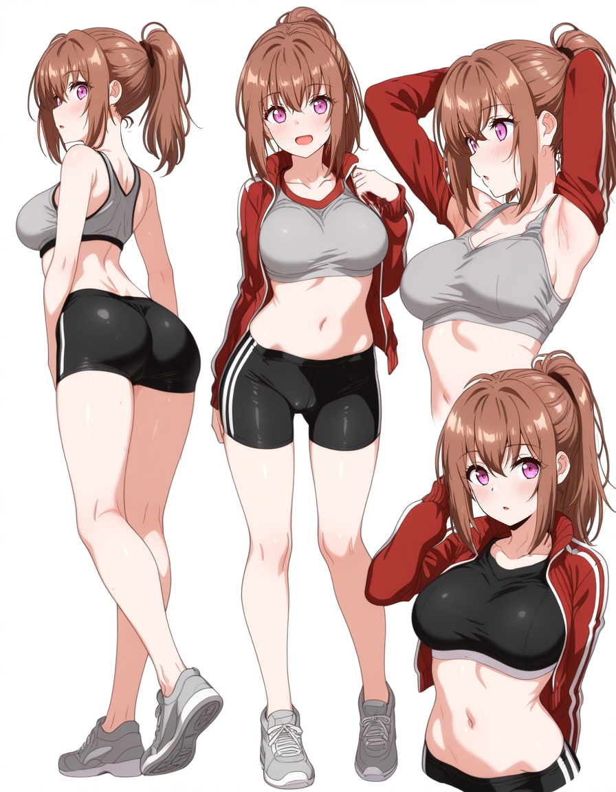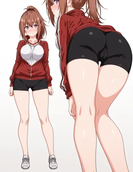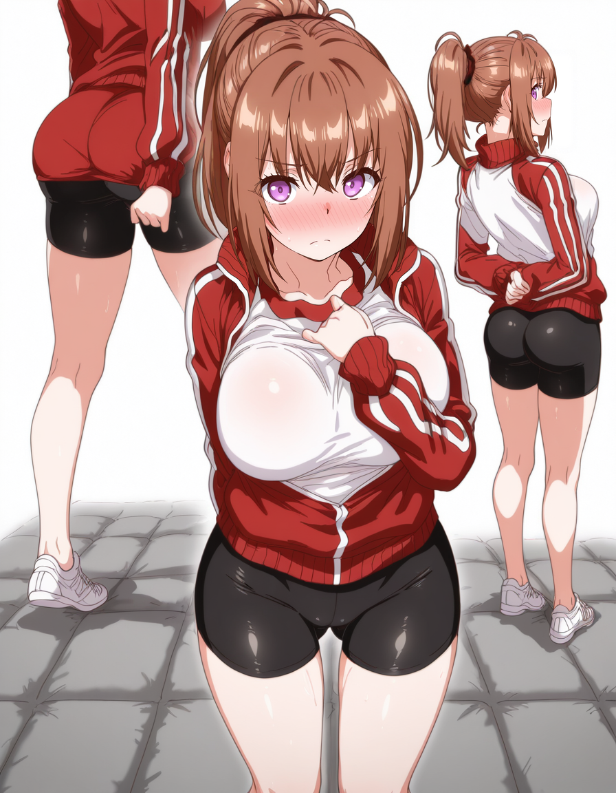 mai_h_hina,ponytail,brown_hair,purple_eyes,large_breasts,red_jacket,white_shirt,black_bike_shorts,white_sneakers