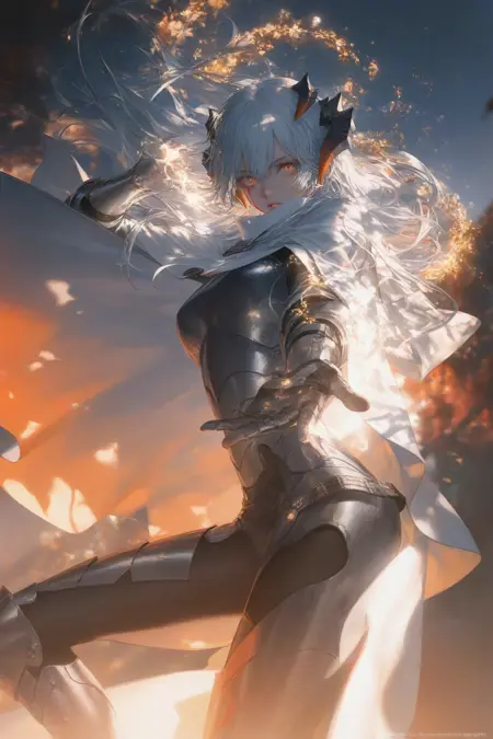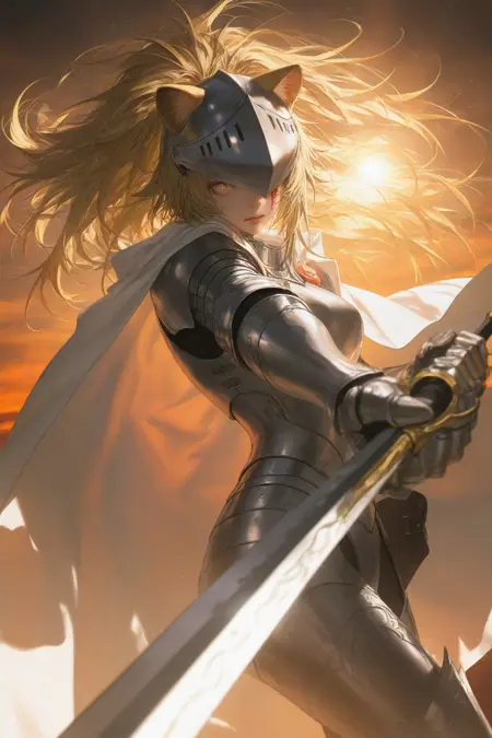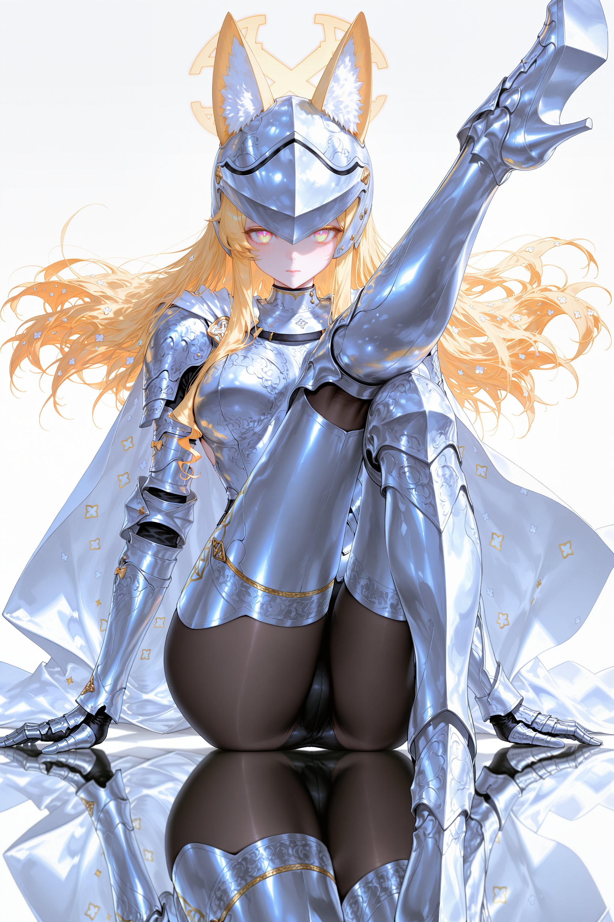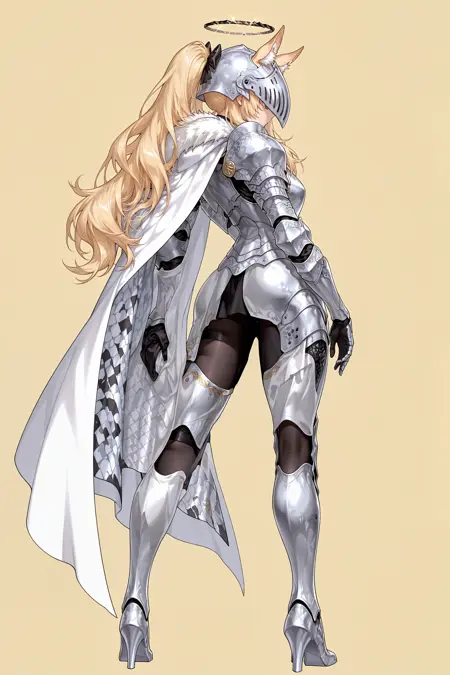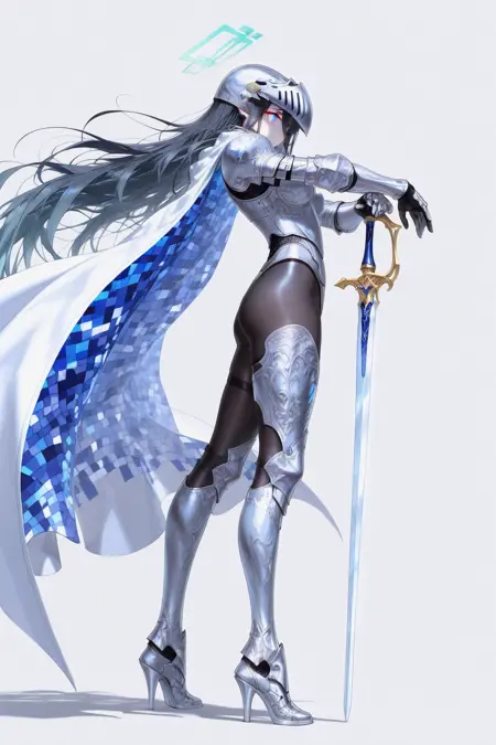 baiyin\(kuijia\),armor,helmet,gauntlets,knight,pantyhose,breastplate,expose hair,high heel boots,black silk lining,cape,full armor,