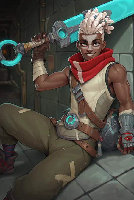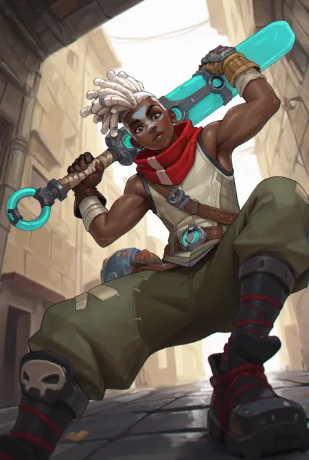true damage ekk0, 线辫, 棕色头发, 深色皮肤, 深色皮肤男性, 面部标记, 无指手套, 黑色手套, 夹克, 耳机, 耳机挂在脖子上, 裤子, 鞋子, 运动鞋