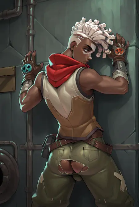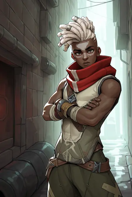 ekk0 101, 深色皮肤, 深色皮肤男性, 面部标记, 白发, 线辫, 手套, 无指手套, 棕色手套, 围巾, 皮带, 衬衫, 无袖, 裤子, 绿色裤子, 靴子