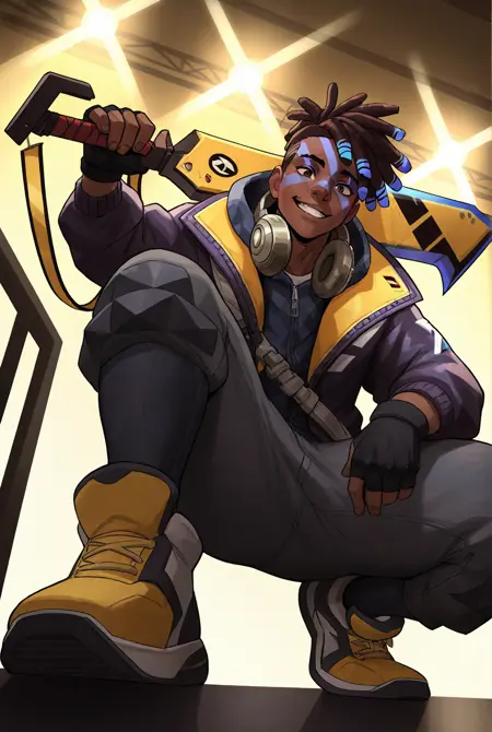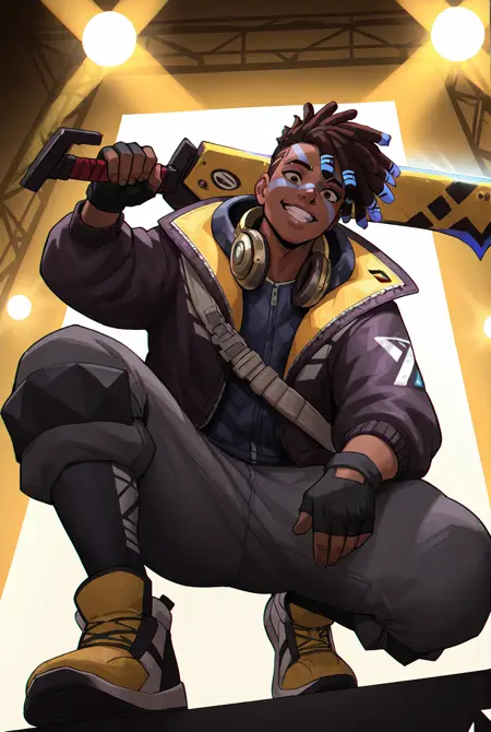 true damage ekk0, dreadlocks, brown hair, dark skin, dark-skinned male, facial mark, fingerless gloves, black gloves, jacket, headphones, headphones around neck, pants, shoes, sneakers