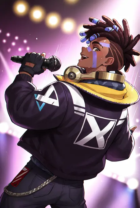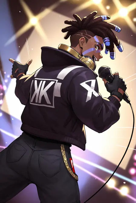 true damage ekk0, dreadlocks, brown hair, dark skin, dark-skinned male, facial mark, fingerless gloves, black gloves, jacket, headphones, headphones around neck, pants, shoes, sneakers