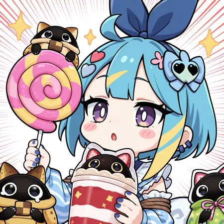 Tags (character 13): lil la sweet, valentine costume, bandaid on hand, blue demon wings, blue hair ribbon, cyan arm warmers, cyan stickers, food-themed hair ornament, heart facial mark, vertical-striped dress, white back bow