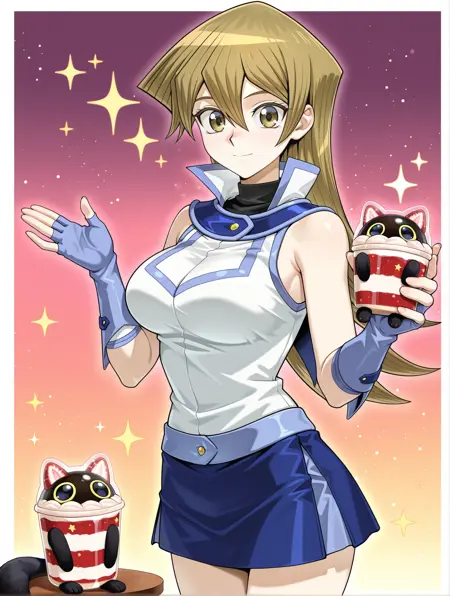 Tags (character 19): duel disk \(yu-gi-oh! gx\), tenjouin asuka, blue fingerless gloves, duel academy uniform \(yu-gi-oh! gx\), white sleeveless shirt, blue skirt, black bodysuit, blue heel boots