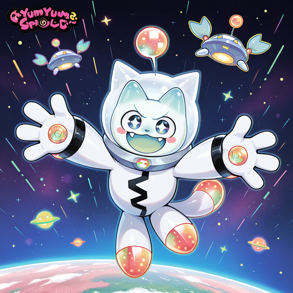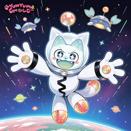 Tags (character 5): yummy snatchy, cyan cat, spacesuit, space helmet, no humans, ufo