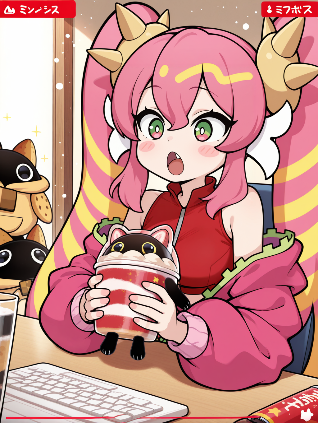 Tags (character 9): ki sikil, pink jacket, red cropped vest, pink sneakers, bandaid on knee, simple background, teeth, black bike shorts, spiked hair ornament
