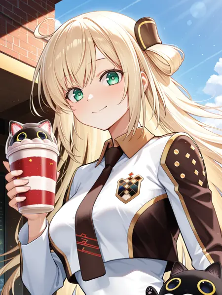 Tags (character 17): sky striker ace - raye, ordinary uniform, brown hair ornament, white cropped jacket, brown waist cape, white collared dress, brown thighhighs, black shoes, brown necktie, black katana, holding black katana,