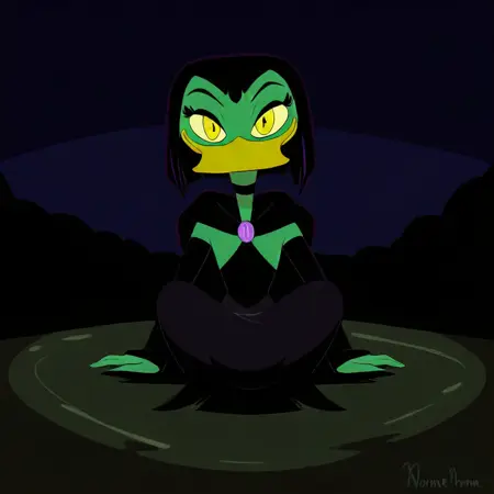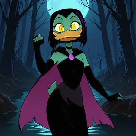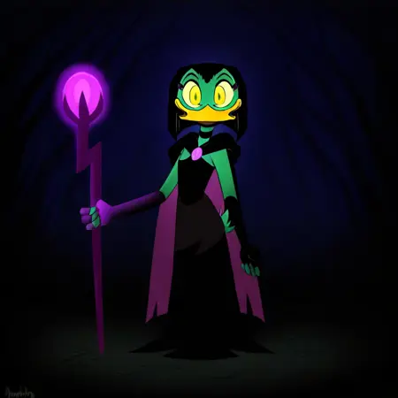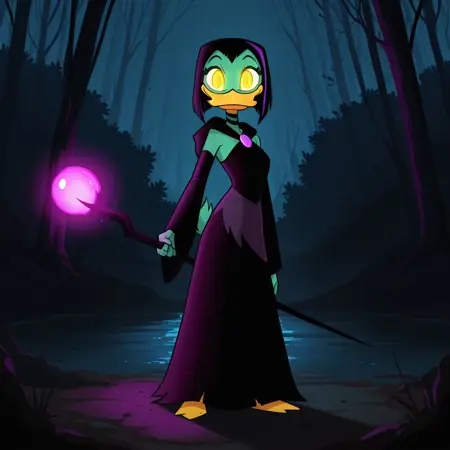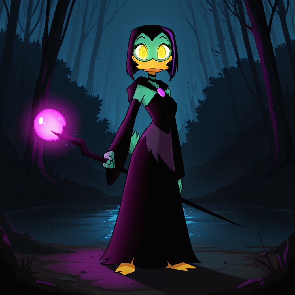 Magica(character), female, anthro, duck, green body, yellow eyes, black hair,