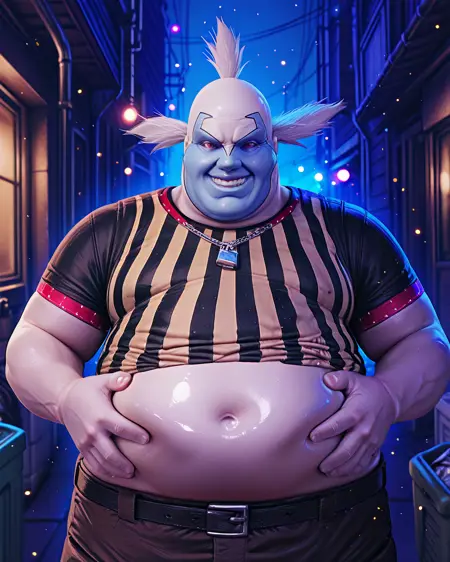 pale skin, overweight, bald, white patches of hair, blue face with black outline, red eyes, dark brown leather jacket, black and yellow striped t-shirt, brown baggy pants, black belt,