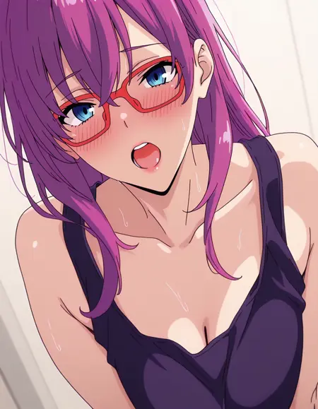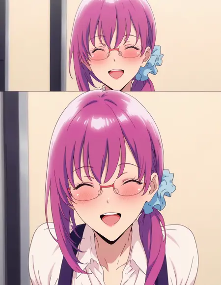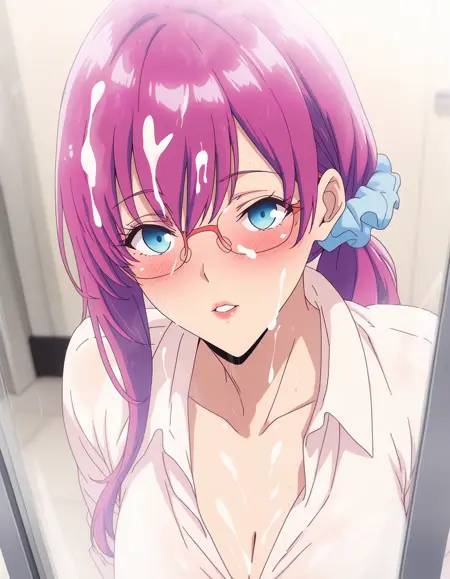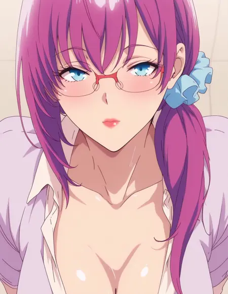 mai_shinonome,long_hair,purple_hair,blue_eyes,lipstick,glasses,hair_scrunchie,pantyhose,high heels,pencil skirt
