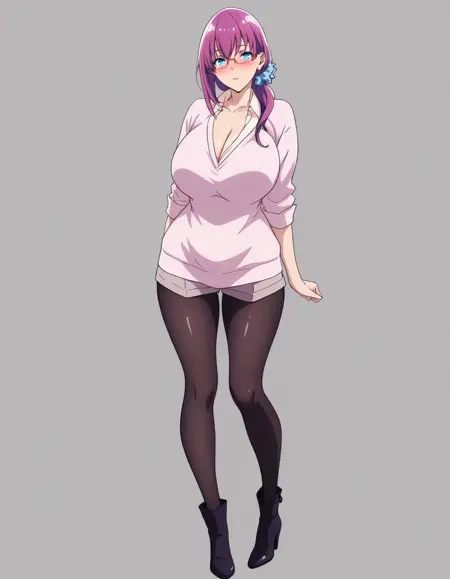 mai_shinonome,long_hair,purple_hair,blue_eyes,hair_ornament,glasses,huge_breasts,hair_scrunchie,ribbed_sweater,sweater_dress,strap_between_breasts,handbag,black_pantyhose,ankle_boots