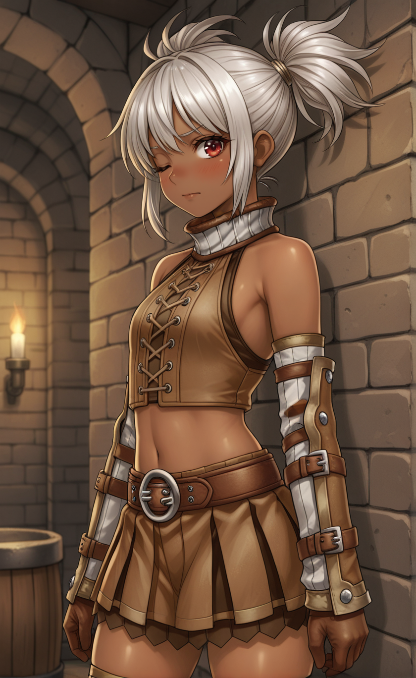 best quality,masterpiece,1girl,w1zlbdwf,solo, (dark-skinned female:1.05), (white hair:0.8), short hair, flat chest, short twintails, (red eyes:1.1),small breasts, miniskirt,pleated skirt, crop top, gloves, brown gloves, turtleneck, armor, brown skirt, buckle, thighhighs, bare shoulders, detached sleeves, midriff, belt,dungeon,candlelight ,sensitive,lora:WizardryLabyrinthDwarfAda:1