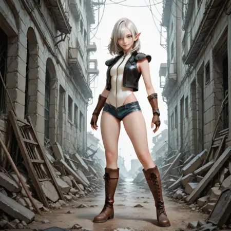 黑色无袖夹克、肩垫、白色紧身衣、护腕、手套、牛仔短裤、及膝靴,