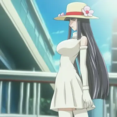 Outfit 2 (Dress): (The_Guts, The_Guts-Ooshima_Mutsuki, Ooshima Mutsuki, Grey eyes, Black Hair, Long Hair, Blunt Bangs, Hime Cut, Large Breast, red lips, white dress, red hat, sun hat, wide brim hat, flower on hat, boots)